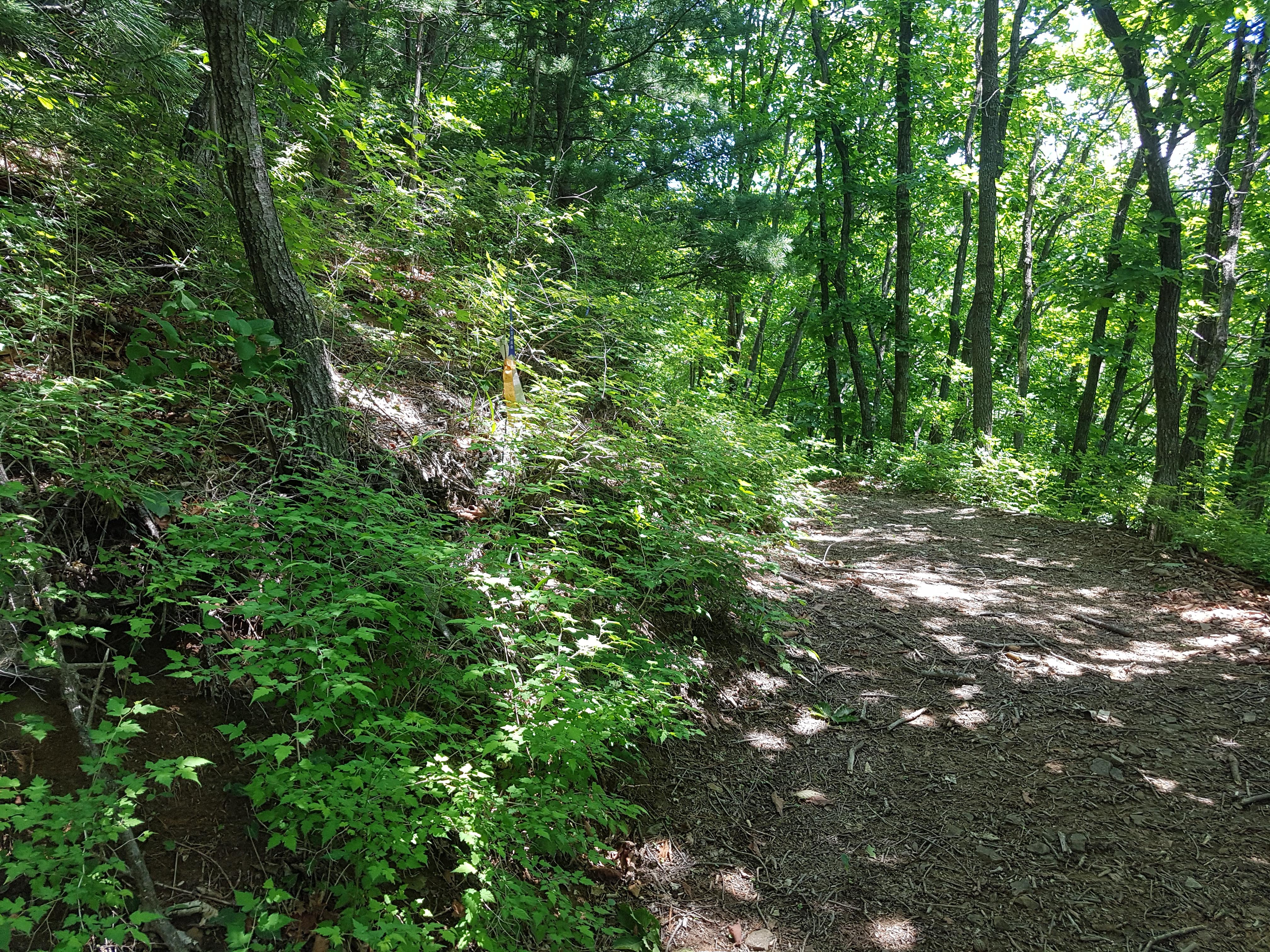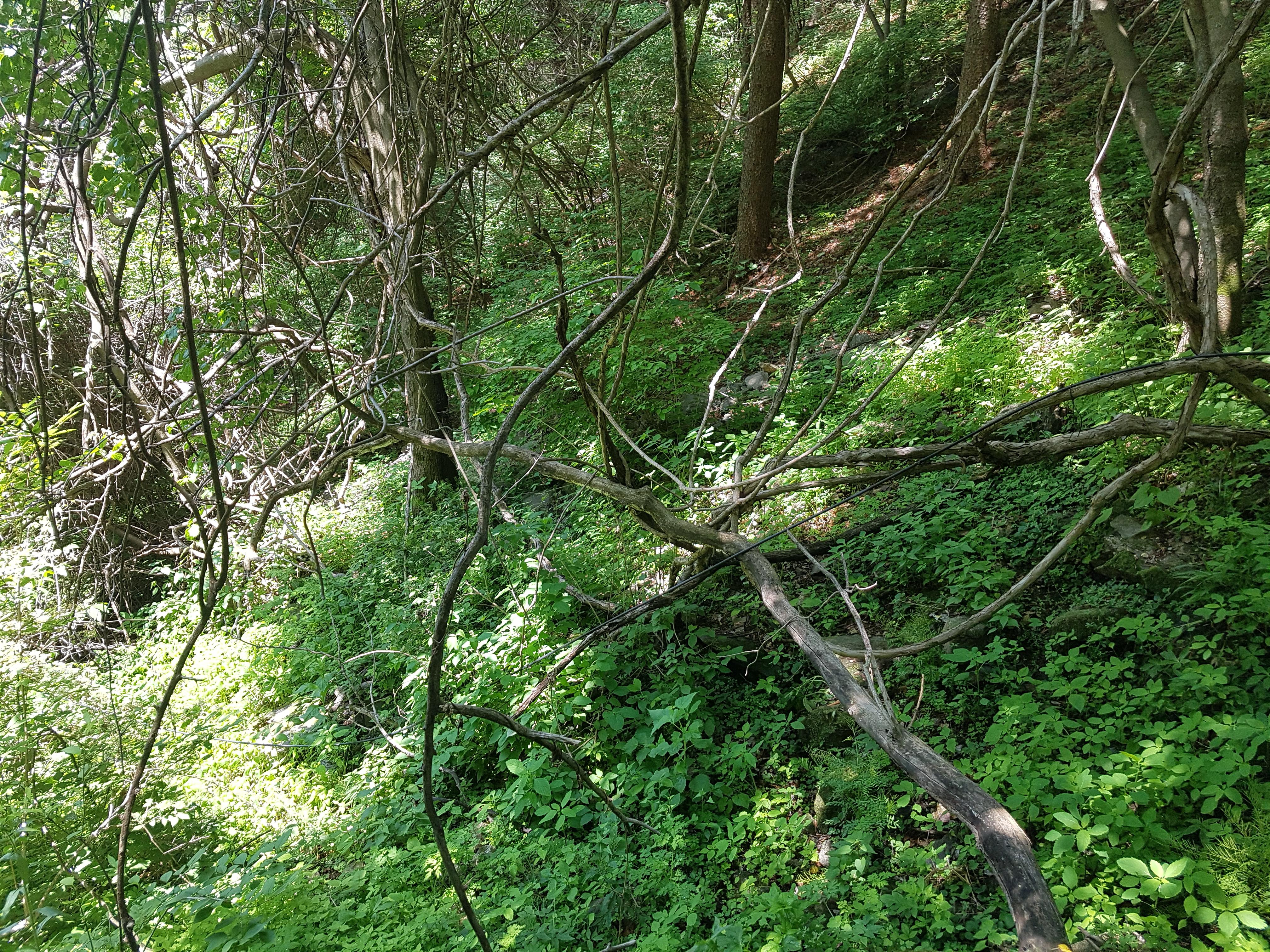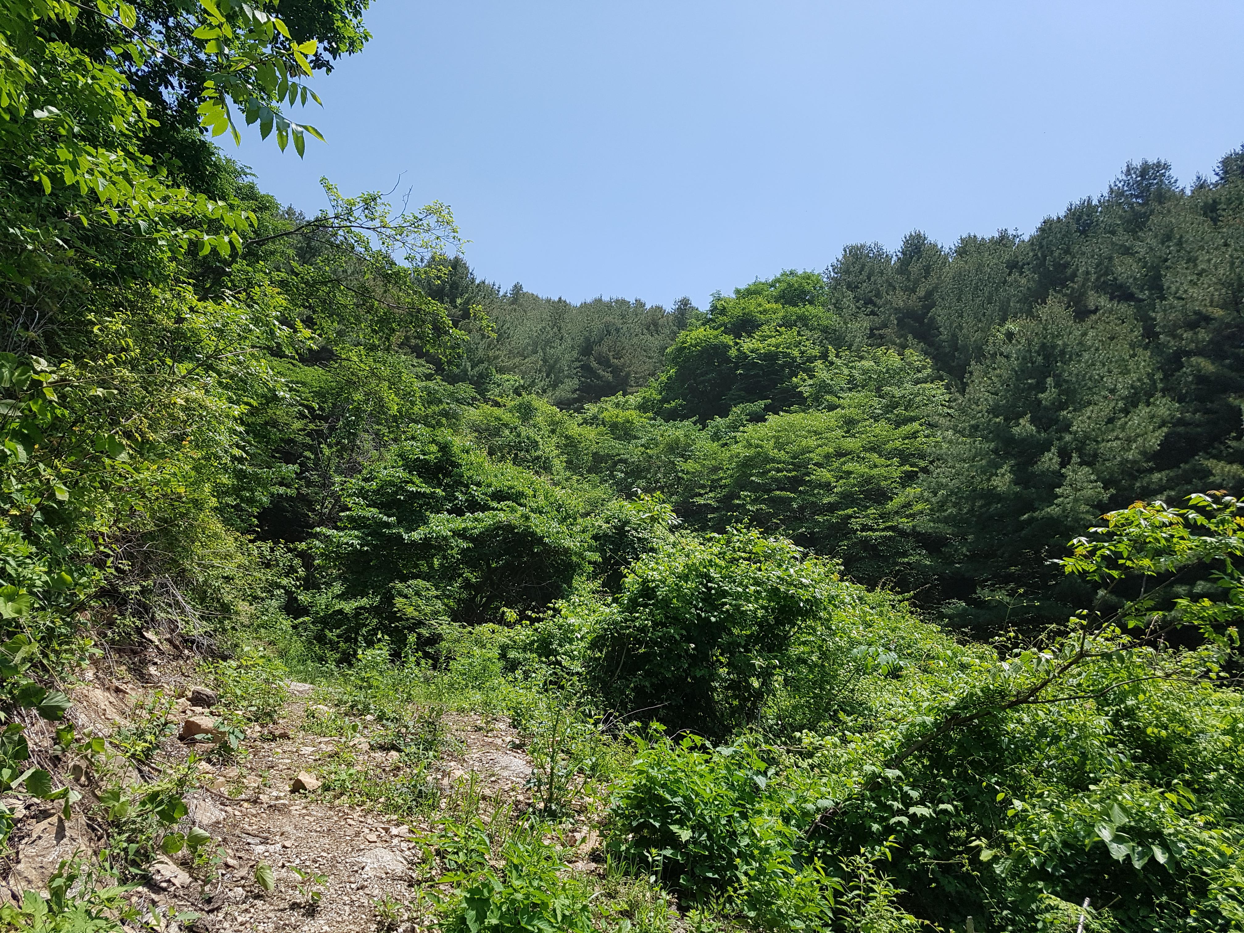 블로그(https://blog.daum.net/0709im/367)를 찾아 확인해보니 군부대를 왼쪽에 끼고 진행한 사진이 보여서 이번엔 왼쪽으로 길을 찾아 봤다. 나무가지와 수풀이 무성해 힘들기는 했지만 그래도 지나갈 수는 있었다.