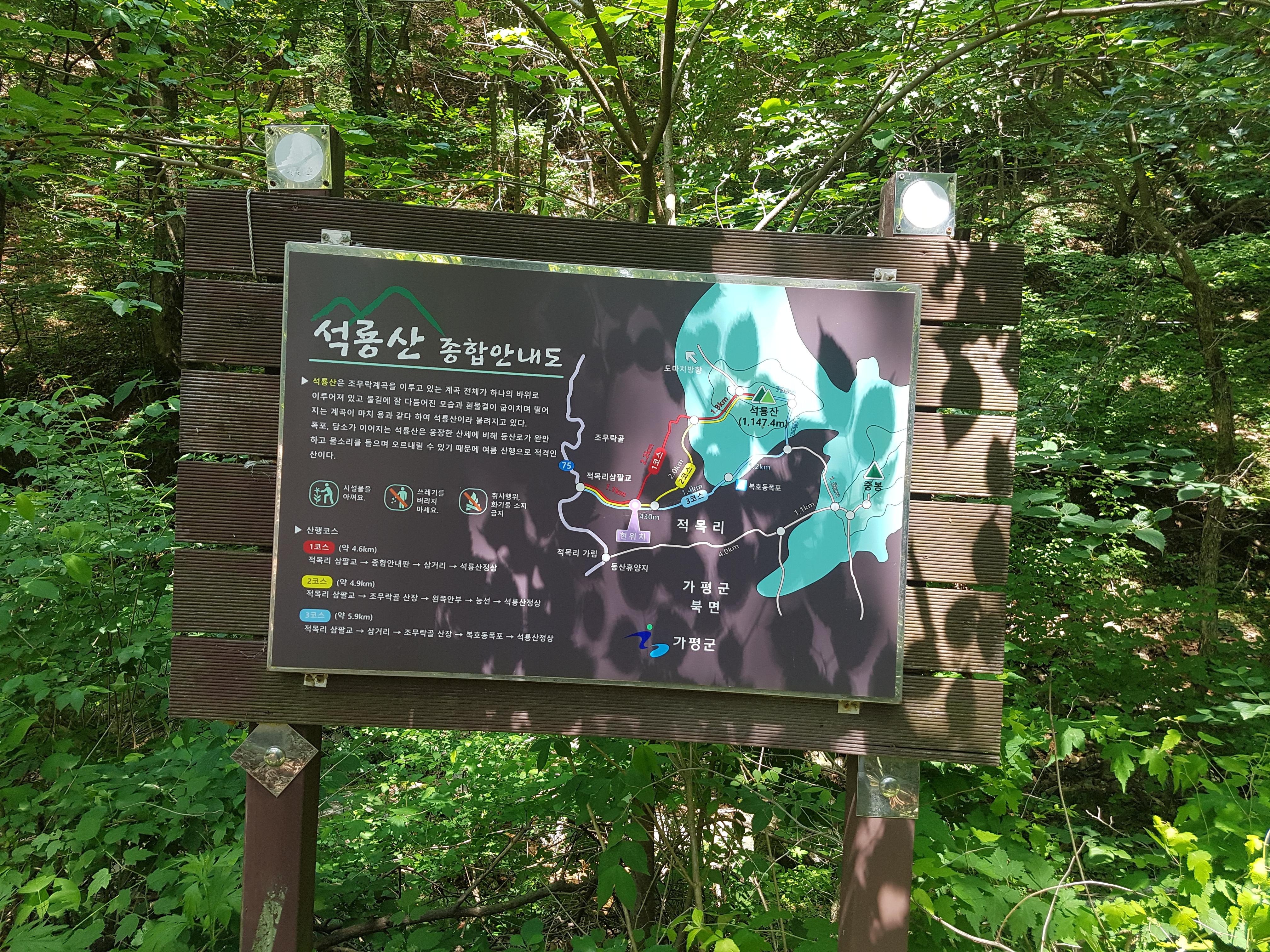 주차를 하고 계곡을 따라 석룡산으로 올라간다. 트렉 끝나고 산행 괘적을 보고 안 사실인데 원래는 2코스로 올라갈 계획 이였는데 무심코 1코스로 올라가 버렸다. 이상하게 오늘 트렉에선 길을 잘못찾고 헤메기 일쑤였다.