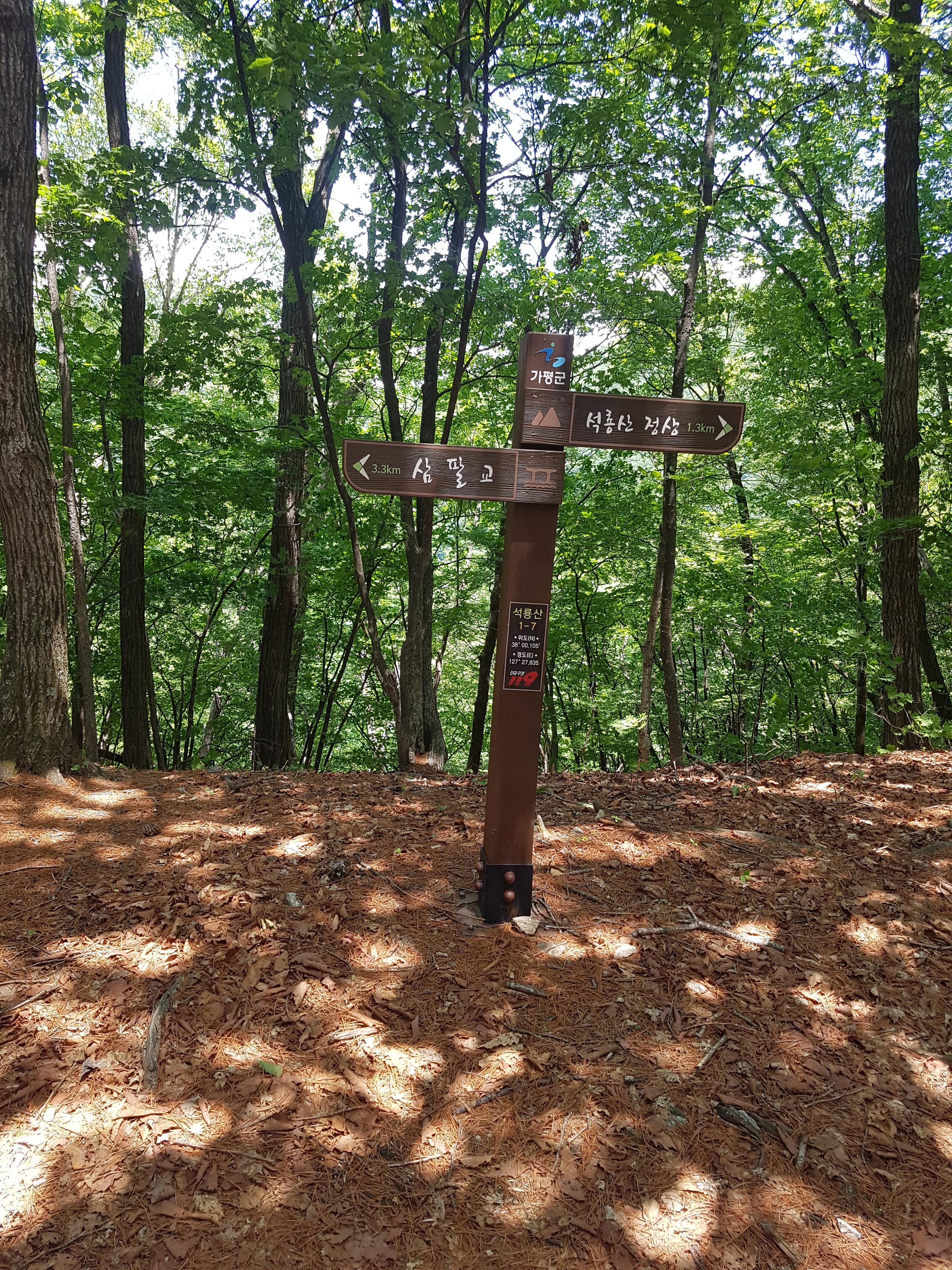 석룡산 이정표가 나타나고 이정표 방향으로 진행하다 보면 멀리 화악산 정상이 보인다. 아쉽게도 화악산 정상은 방공포 부대가 들어서 있어 출입이 안된다.