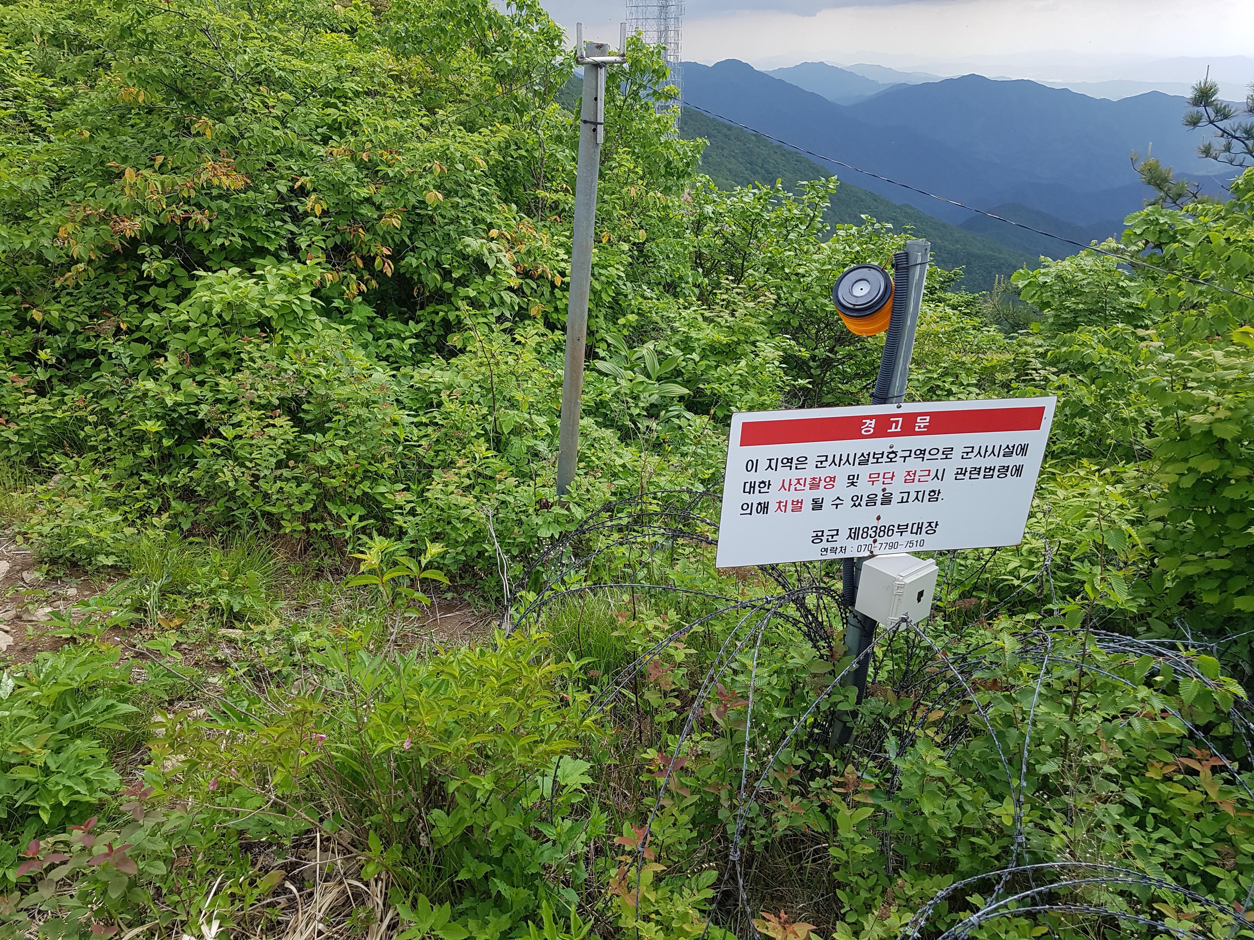 철조망과 경고문이 보이기 시작하면서 앞으로 가는 길이 없어진다. 왼쪽으로 리본이 달린 내려가는 길이 있는데 아무래도 하산하는 길처럼 보여 일단 군부대 철조망을 따라 돌아보기로 한다.